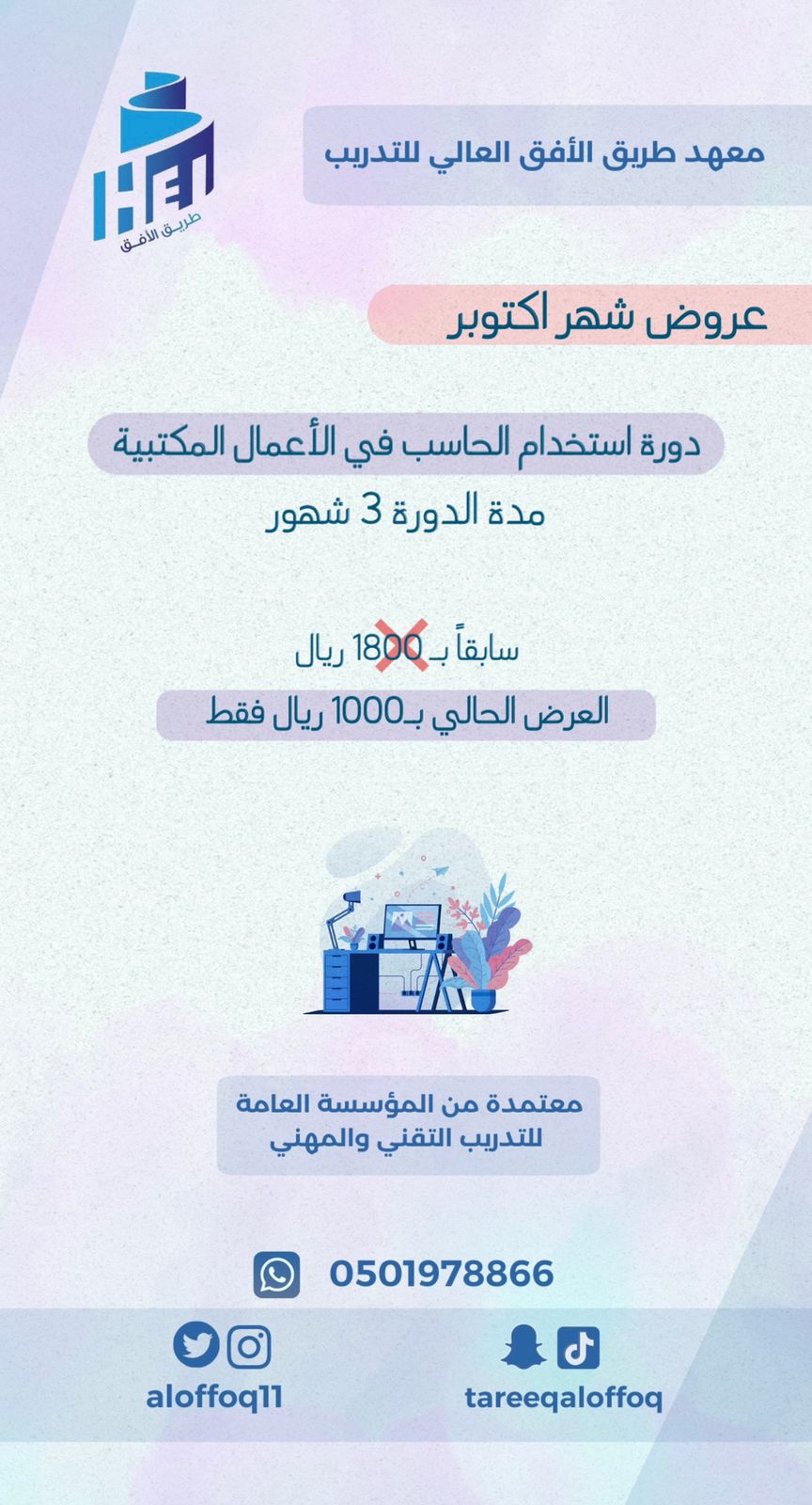 | الإلمام بالمفاهيم الأساسية لمبادئ الحاسب الآلي وكيفية التعامل مع نظام التشغيل وسرعة الطباعة باللمس، تنسيق النصوص والخطابات، استخدام الجداول الإلكترونية والرسوم البيانية، إعداد العروض التقديمية المرئية، التعرف على استخدام الإنترنت، التعرف على استخدام البريد الإلكتروني، والتعرف على استخدام برنامج اوت لوك والتأهل لدخول اختبارات الأعمال المكتبية. |